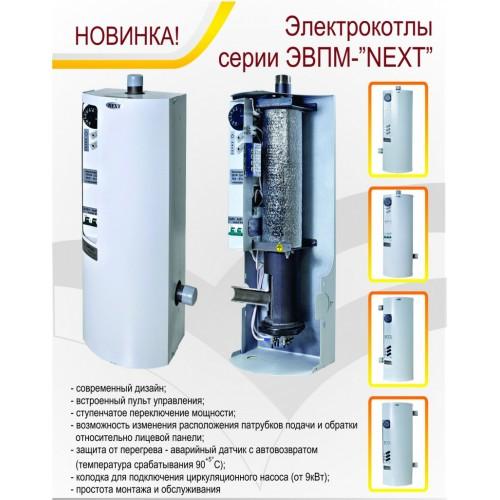 Верхний напорный и нижний обратный патрубки предназначены для присоединения водонагревателя к системе отопления. В электрокотле ЭВПМ-NEXT реализована возможность изменения расположения патрубков подачи и обратки относительно лицевой панели. На лицевой стороне водонагревателя расположена ручка регулятора температуры и клавиши переключения мощности. На нижней части корпуса имеется заглушка ступенчатая для ввода в пульт питающего кабеля. Болт для крепления заземляющего провода расположен внутри корпуса на кронштейне крепления колбы котла.