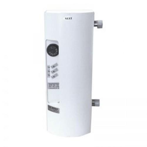 Верхний напорный и нижний обратный патрубки предназначены для присоединения водонагревателя к системе отопления. В электрокотле ЭВПМ-NEXT реализована возможность изменения расположения патрубков подачи и обратки относительно лицевой панели. На лицевой стороне водонагревателя расположена ручка регулятора температуры и клавиши переключения мощности. На нижней части корпуса имеется заглушка ступенчатая для ввода в пульт питающего кабеля. Болт для крепления заземляющего провода расположен внутри корпуса на кронштейне крепления колбы котла.