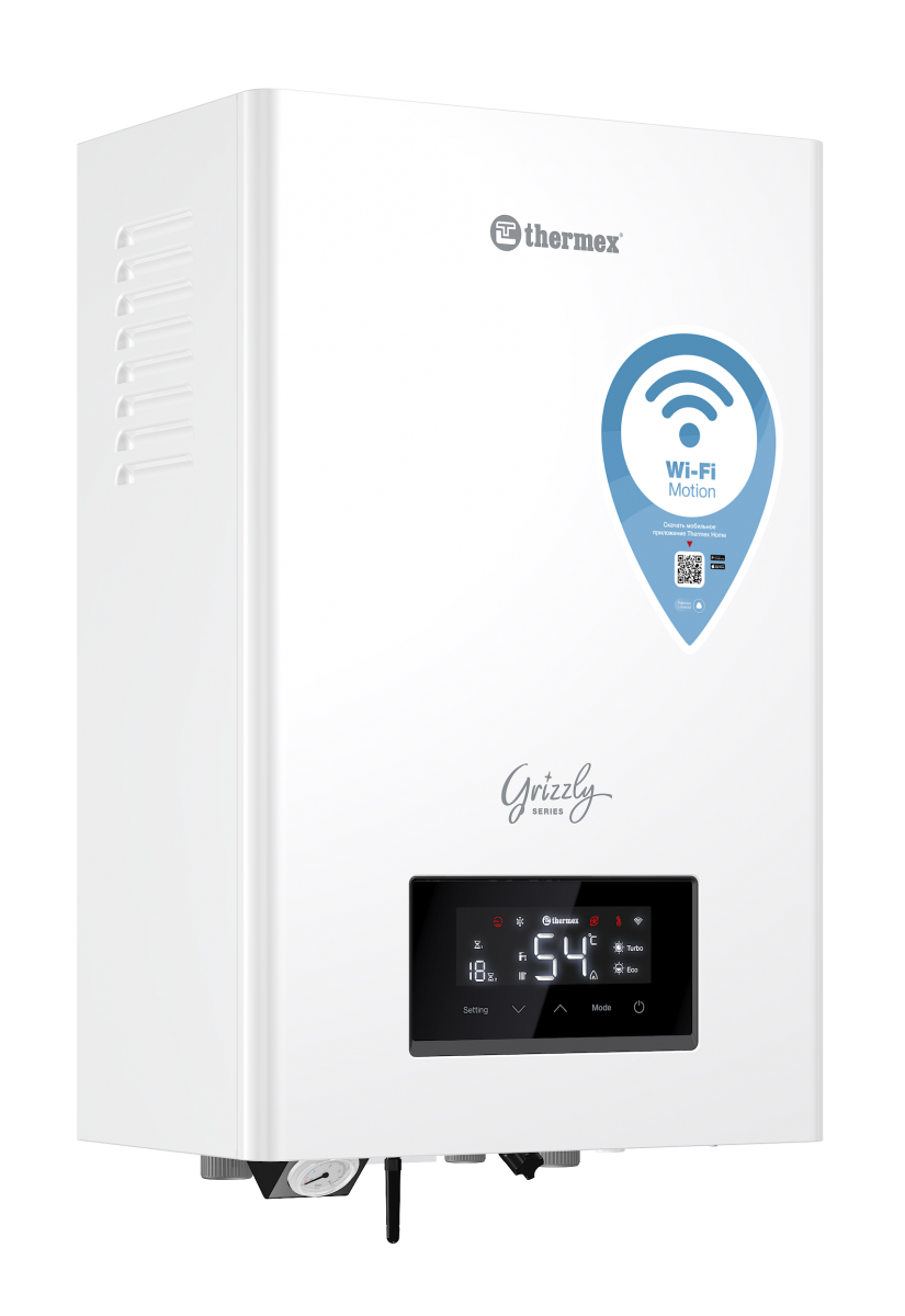 Технология Wi-Fi Motion. Позволяет постоянно отслеживать работу котла в приложении Thermex Home на личном планшете или смартфоне, включать, отключать и настраивать работу. Также в приложении можно создавать алгоритмы работы по времени и дню недели, а также программировать работу котла в зависимости от внешних условий, например, погоды за окном.