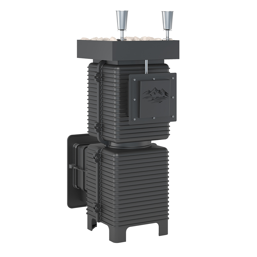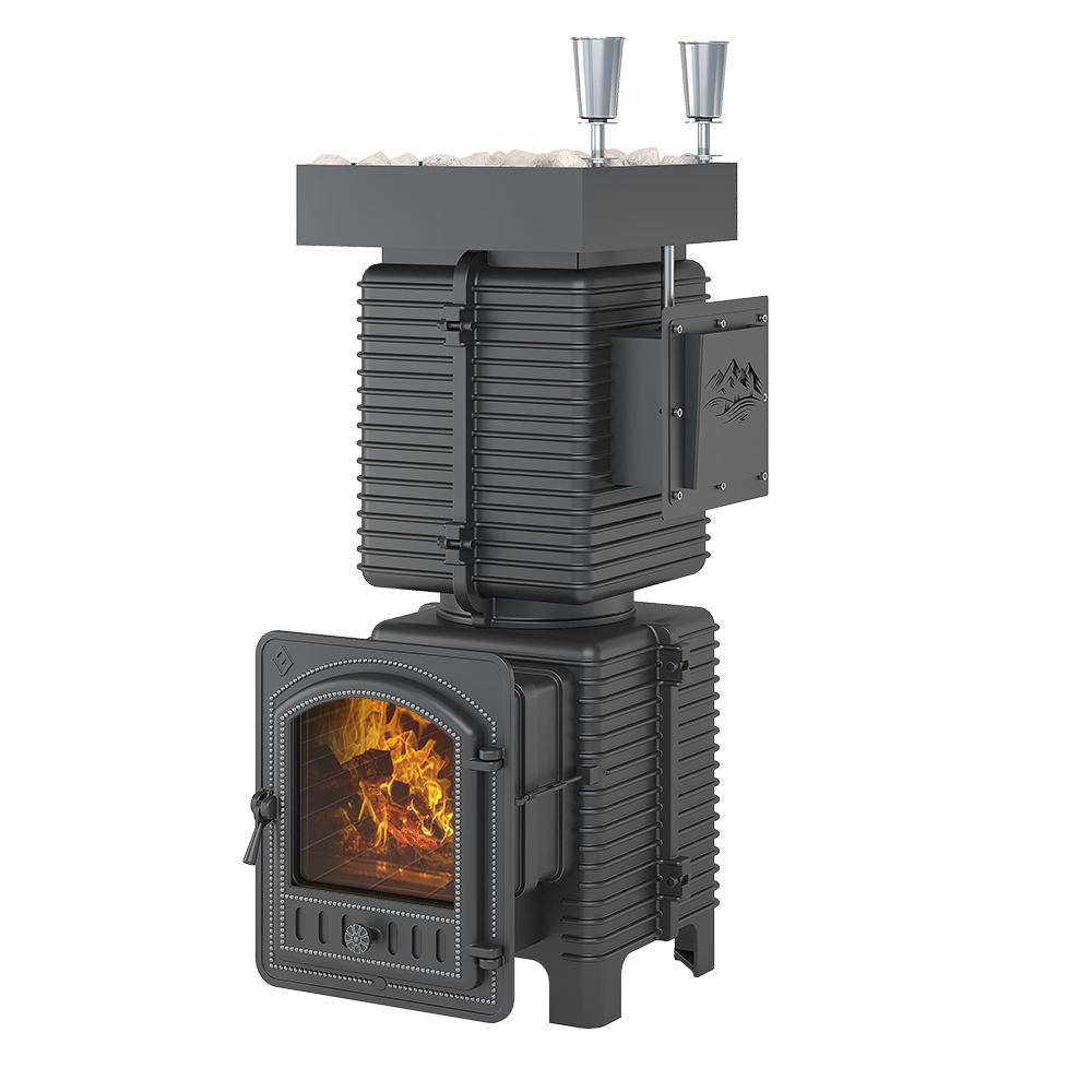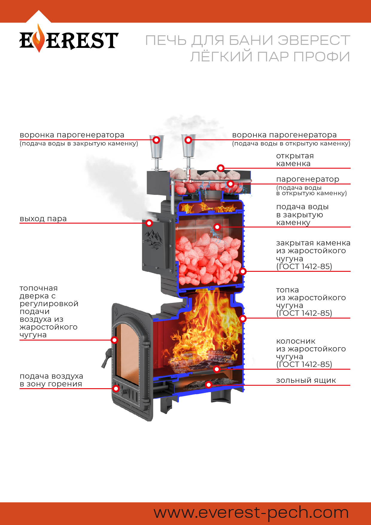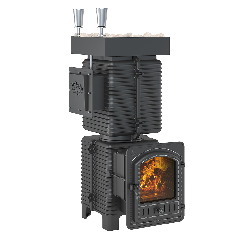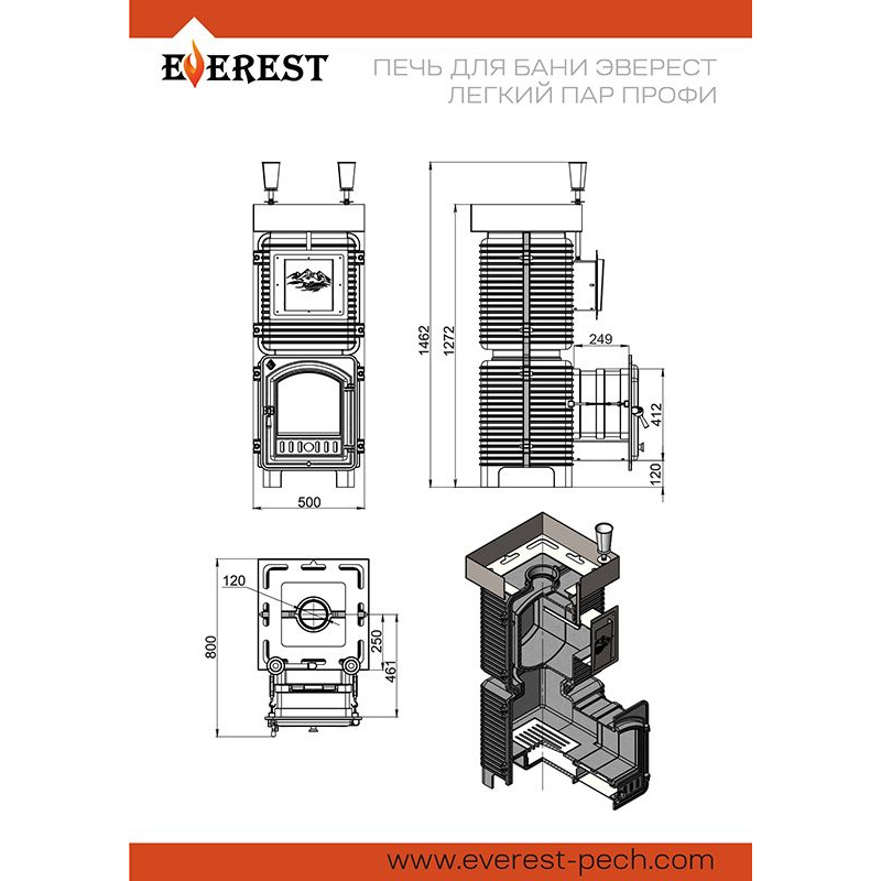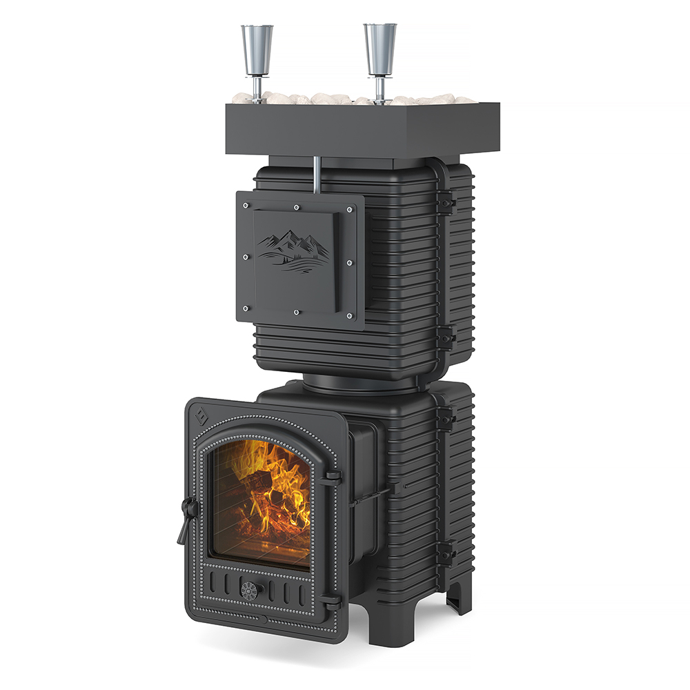 Поворотная чугунная банная печь EVEREST Лёгкий Пар ПРОФИ предназначена для обогрева парных помещений объёмом до 44 кубических метров и получения пара при эксплуатации в частных и коммерческих банях.Печь состоит из двух модулей: топочной камеры и закрытой каменки из чугуна. Наиболее термонагруженные участки печи сделаны из жаропрочного чугуна толщиной 20 миллиметров. Для увеличения площади теплоотдачи по всей поверхности печи устроено оребрение, за счёт которого чугун быстрее отдаёт тепло в окружающее пространство и способствует ускорению нагрева парной, каменного заклада и облицовки печи.Топочная часть и каменка при установке печи могут быть повёрнуты друг относительно друга. Это позволяет направить отверстие каменки в парилке в удобную сторону, а также организовать обслуживание печи и укладку дров в печь прямо из парной. После установки на место каменка и топка соединяются между собой при помощи герметика и термостойкого шнура.Закрытая каменка из чугуна толщиной 10 миллиметров сверху и снизу имеет закруглённую конструкцию. Каменка находится на месте пламегасителя. Огонь при горении дров охватывает каменку с четырёх сторон, что ускоряет нагрев заклада.Закрытая каменка рассчитана на размещение 60 килограммов камня для бани, создаёт массивный тепловой заряд. Каменка и внешний корпус изготовлены из чугуна, крепятся друг к другу по типу «паз-гребень» с использованием термостойкого герметика.В качестве открытой каменки выше основной части печи размещён стальной поддон для камней, куда умещается более 60 кг камня. Совокупный вес печи и заклада составляет более 400 кг.Для получения пара обе каменки печи EVEREST Лёгкий Пар ПРОФИ оборудованы парогенераторами. Парогенератор закрытой каменки зафиксирован в корпусе печи, а парогенератор открытой каменки укладывается между камнями в верхнем поддоне. Чугунная дверка артикул 290 специально разработана для этой печи, обеспечивает регулировку подачи воздуха в широких пределах и безопасность использования печи, не деформируется при длительном нагреве.