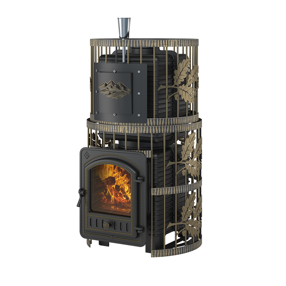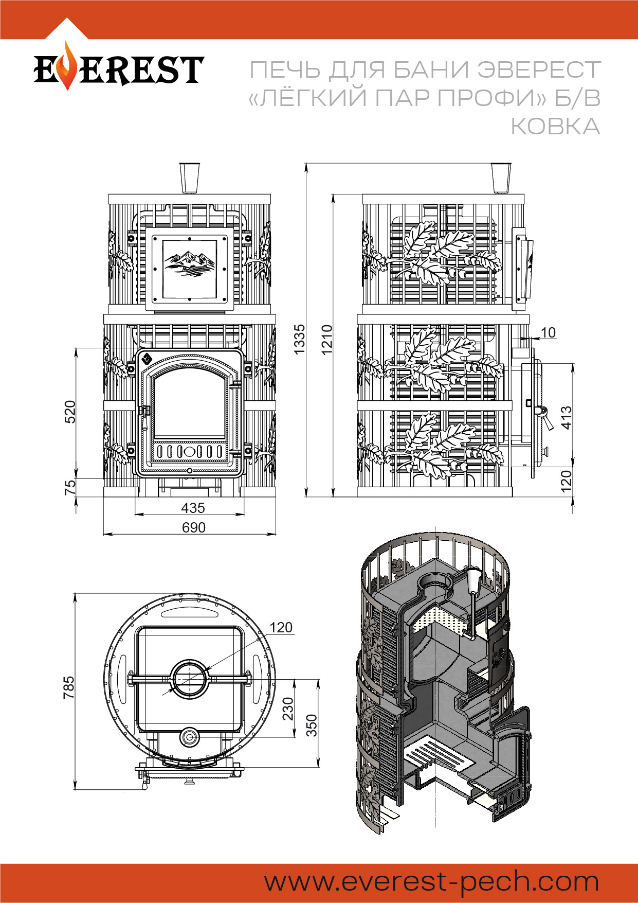 Поворотная чугунная банная печь EVEREST Лёгкий Пар ПРОФИ предназначена для обогрева парных помещений объёмом до 40 кубических метров и получения пара при эксплуатации в частных и коммерческих банях.Печь состоит из двух модулей: топочной камеры и закрытой каменки из чугуна. Наиболее термонагруженные участки печи сделаны из жаропрочного чугуна толщиной 20 миллиметров. Для увеличения площади теплоотдачи по всей поверхности печи устроено оребрение, за счёт которого чугун быстрее отдаёт тепло в окружающее пространство и способствует ускорению нагрева парной, каменного заклада и облицовки печи.Топочная часть и каменка при установке печи могут быть повёрнуты друг относительно друга. Это позволяет направить отверстие каменки в парилке в удобную сторону, а также организовать обслуживание печи и укладку дров в печь прямо из парной. После установки на место каменка и топка соединяются между собой при помощи герметика и термостойкого шнура.Закрытая каменка из чугуна толщиной 10 миллиметров сверху и снизу имеет закруглённую конструкцию. Каменка находится на месте пламегасителя. Огонь при горении дров охватывает каменку с четырёх сторон, что ускоряет нагрев заклада.Закрытая каменка рассчитана на размещение 60 килограммов камня для бани, создаёт массивный тепловой заряд. Каменка и внешний корпус изготовлены из чугуна, крепятся друг к другу по типу «паз-гребень» с использованием термостойкого герметика.В качестве открытой каменки выше основной части печи размещён стальной поддон для камней, куда умещается более 60 кг камня. Совокупный вес печи и заклада составляет более 400 кг.Для получения пара печь EVEREST Лёгкий Пар ПРОФИ оборудована парогенератором. Чугунная дверка артикул 290 специально разработана для этой печи, обеспечивает регулировку подачи воздуха в широких пределах и безопасность использования печи, не деформируется при длительном нагреве.