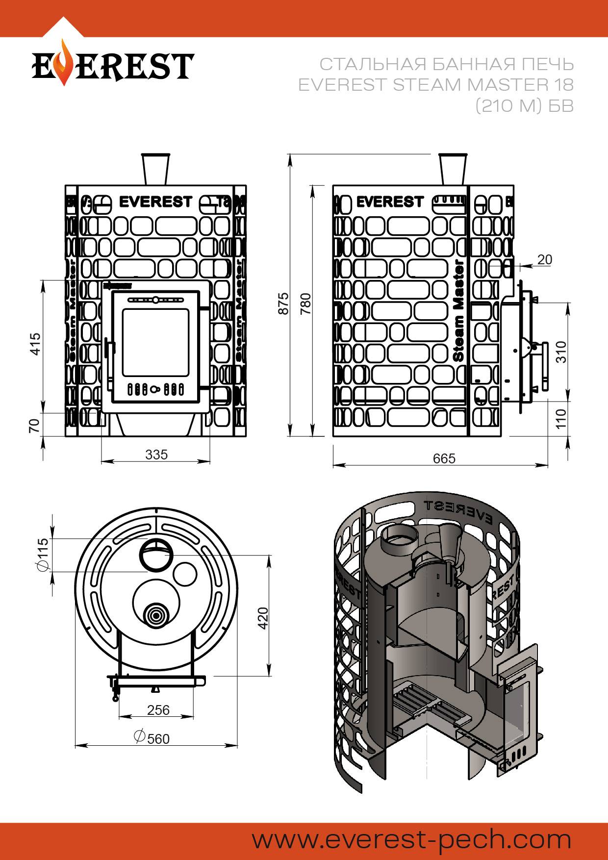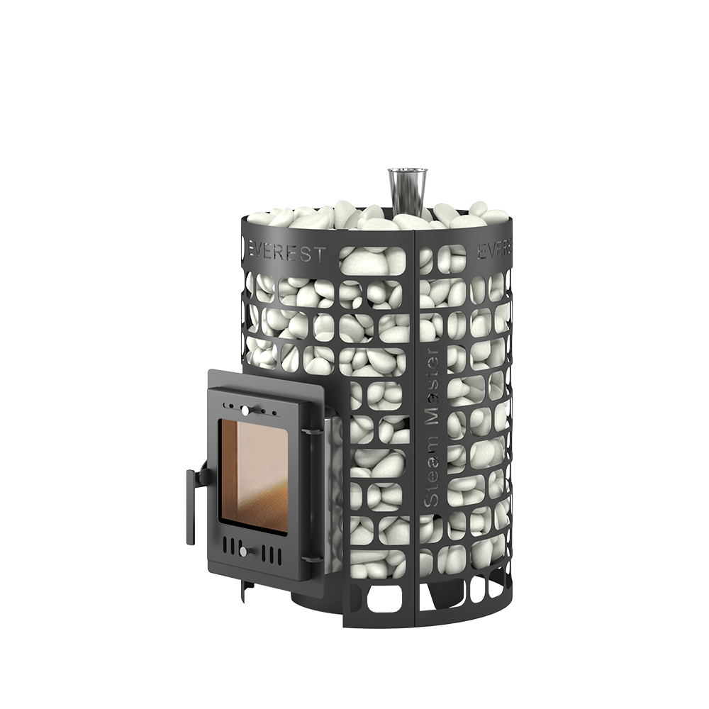 Печь для бани Эверест "Steam Master" 18 (210М) изготовлена из особо прочной котловой стали 09Г2С. Печь предназначена для установки в частные и коммерческие бани с объёмами парных помещений до 18 кубических метров.Печь и сетка внешней каменки цилиндрической формы, компактная и удобно размещаемая в парилке. Конструкция печи включает в себя закрытую каменку из нержавейки марки AISI-430 толщиной 4 мм, расположенную в верхней части топки. Каменка размещена прямо на пути пламени и дымовых газов, что позволяет нагреть камни до температур свыше 600 градусов по Цельсию.Для эффективного сгорания топлива по боковым сторонам топки предусмотрены два канала для подачи воздуха на вторичное горение.Каменка рассчитана на 15 кг камня для бани мелкой и средней фракции. Воду подают в каменку с помощью двух заливных воронок, посредством которых вода попадает на нижний и средний ярусы уложенных камней. Пар выходит через верхнюю крышку с отверстиями.Крышка печи и каменка – съёмные элементы, позволяют ухаживать за топкой и каменкой. В крышке топки есть два прочистных отверстия для обслуживания дымохода и верхней части каменки. Отверстия закрыты стальными заглушками.Печь подключается к дымоходу диаметром 115 мм.Стальная дверь артикул 210 М оснащена системами подачи воздуха в колосниковую зону и на стекло. С помощью размещённых в двери отверстий можно регулировать интенсивность горения дров и обеспечивать чистоту стекла.Внешний тепловой контур образован открытой каменкой в виде цилиндрической сетки, вмещающей в себя 100 килограммов камней. Сетка сделана из стали, в новом минималистичном дизайне EVEREST.