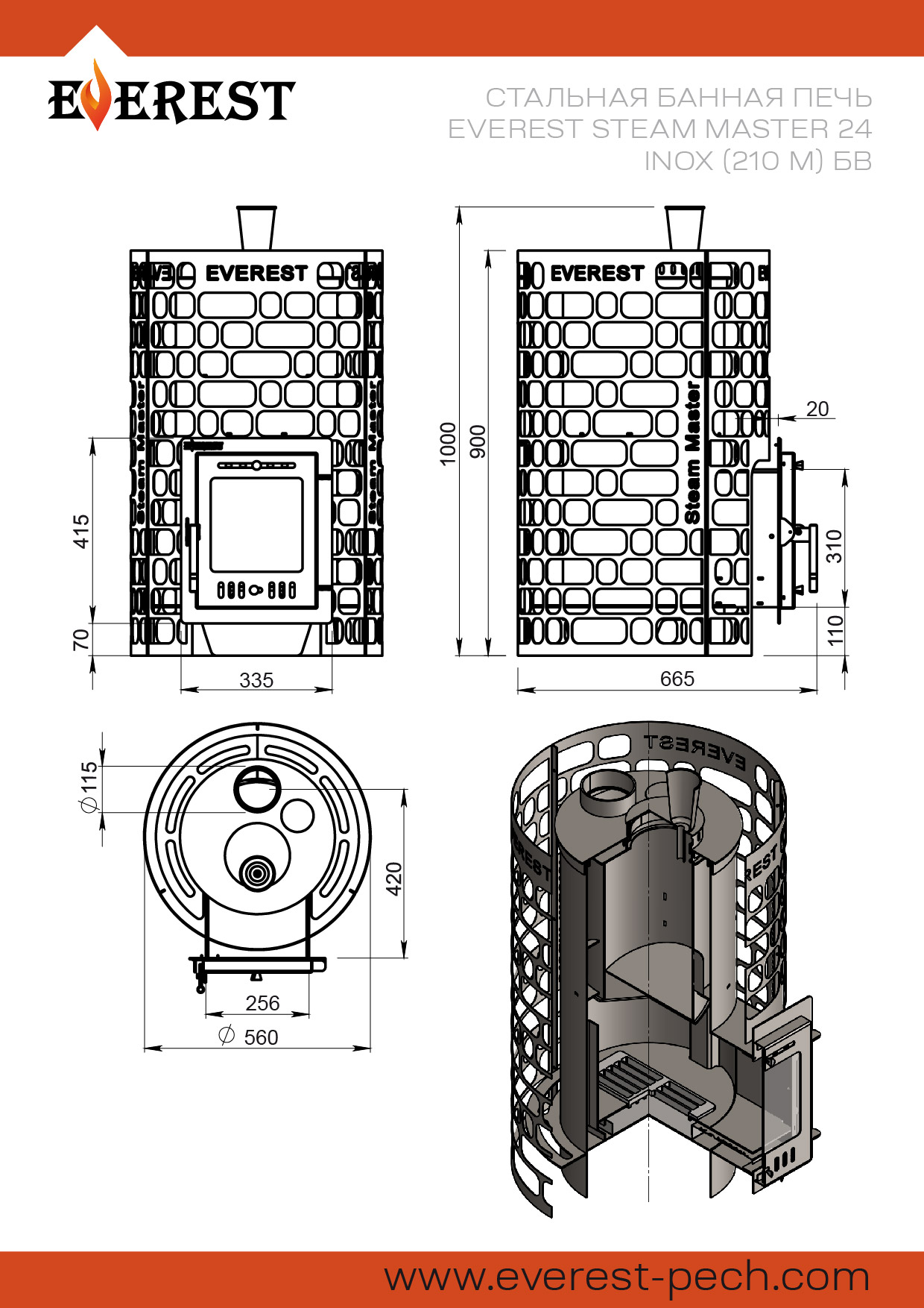 Печь для бани Эверест "Steam Master" 24 INOX (210М) б/в изготовлена из нержавеющей стали и предназначена для установки в частные и коммерческие бани с объёмами парных помещений от 12 до 24 м3.Печь и сетка внешней каменки цилиндрической формы, компактная и удобно размещаемая в парилке.Конструкция печи включает в себя закрытую каменку из нержавейки марки AISI 430 толщиной 4 мм, расположенную в верхней части топки. Каменка оригинальной формы размещена прямо на пути пламени и дымовых газов, что позволяет нагреть камни до температур свыше 600 ºС.Для эффективного сгорания топлива по боковым сторонам топки предусмотрены два канала для подачи воздуха на вторичное горение.Каменка рассчитана на 15-20 кг камня для бани мелкой и средней фракции. Воду в каменку подают с помощью заливной воронки, через которую вода попадает примерно в середину массива уложенных камней. Пар выходит через верхнюю крышку с отверстиями. На этой крышке крепится воронка для подачи воды.Крышка печи и каменка – съёмные элементы, позволяют ухаживать за топкой и каменкой. Форма каменки со скосом в передней части исключает накопление сажи сверху, на каменке. Сажа из дымохода по переднему краю каменки попадает в топку, где сгорает, не причиняя вреда печи, каменке и дымоходу.Печь подключается к дымоходу диаметром 115 мм.Стальная дверь артикул 210М оснащена системами подачи воздуха в колосниковую зону и на стекло. С помощью размещённых в двери отверстий можно регулировать интенсивность горения дров и обеспечивать чистоту стекла.Внешний тепловой контур образован открытой каменкой в виде цилиндрической сетки, вмещающей в себя ок. 100 кг камней. Сетка сделана из стали, в новом минималистичном дизайне EVEREST.