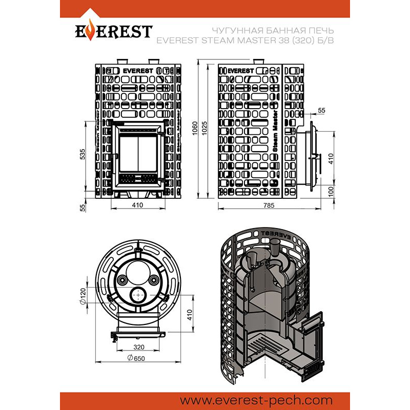 Банная печь Эверест "Steam Master" 38 (320) ЧУГУН б/в) предназначена для нагрева помещений и получения пара в парных объёмом до 38 кубических метров.Печь изготовлена из качественного чугуна и отличается интересной конструкцией. Толщина металла составляет от 8 до 24 мм в зависимости от детали печи (наиболее термонагруженные участки имеют большую толщину чугуна).Топочная камера печи – сборная, состоит из трёх деталей, соединяемых между собой на болтах. Вертикальные швы по краю деталей соединяются по принципу паз-гребень, что обеспечивает высокую герметичность топки и минимальную деформацию даже при длительном нагреве. Соединение не требует применения уплотнителей шва, достаточно только герметика.Верхняя часть топки изготовлена из чугунных колец. В печи Эверест "Steam Master" 38 (320) ЧУГУН б/в между топкой и крышкой размещены два кольца высотой 120 мм.На дне цилиндрической топочной камеры уложен чугунный колосник размером 20 на 30 см, обеспечивающий хороший доступ воздуха для горения. Подача воздуха происходит через щелевидные отверстия в двери печи.Для полного сгорания топлива в топке устроены каналы вторичного дожига, подающие воздух из поддувала в верхние точки камеры, в места скопления разогретых газов. Это обеспечивает максимальную эффективность горения и высокий КПД печи Эверест "Steam Master" 38 (320) ЧУГУН б/в.Чугунная дверь артикул 320 имеет верхнюю и нижнюю системы подачи воздуха. За счёт работы обеих систем регулируется интенсивность горения и обеспечивается чистота стекла во время работы печи. Плотный контакт двери и рамки делает топочное пространство максимально герметичным.Закрытая каменка печи изготовлена из нержавеющей стали марки AISI 430 толщиной 4 мм. Каменка размещается прямо на пути пламени и горящих газов, что позволяет нагревать камни со всех сторон и быстро достигать температуры 450-500 градусов по Цельсию.Форма каменки обеспечивает максимальное снятие энергии с горящих в топке дров. Объём топки рассчитан на размещение 50-60 кг камней для бани. Выход пара происходит через верхнюю крышку с отверстиями.Для подачи воды в каменку предусмотрены 2 заливные воронки, направляющие воду в нижний и средний ярус заклада каменки. Это позволяет легче управлять паром и получать пар разной степени насыщенности.