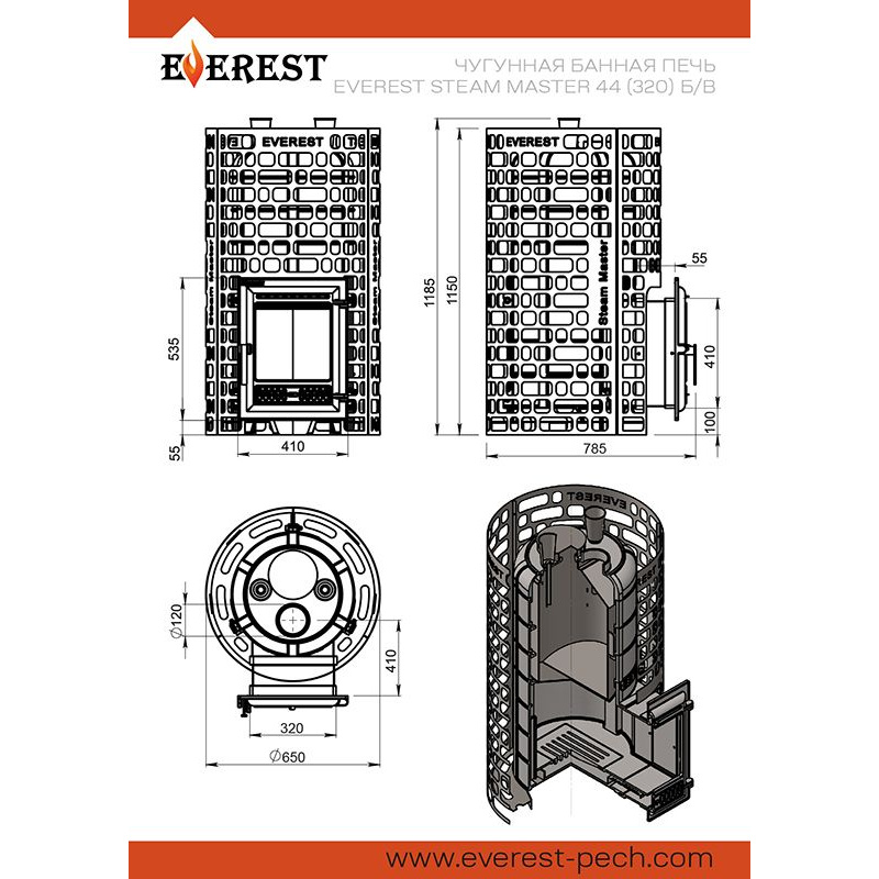 Банная печь Эверест "Steam Master" 44 (320) ЧУГУН б/в предназначена для нагрева помещений и получения пара в парных объёмом до 44 кубических метров.Печь изготовлена из качественного чугуна и отличается интересной конструкцией. Толщина металла составляет от 8 до 24 мм, в зависимости от детали печи (наиболее термонагруженные участки имеют большую толщину чугуна).Топочная камера печи – сборная, состоит из трёх деталей, соединяемых между собой на болтах. Вертикальные швы по краю деталей соединяются по принципу паз-гребень, что обеспечивает высокую герметичность топки и минимальную деформацию даже при длительном нагреве. Соединение не требует применения уплотнителей шва, достаточно только герметика.Верхняя часть топки изготовлена из чугунных колец. В печи Эверест "Steam Master" 44 (320) ЧУГУН б/в между топкой и крышкой размещены три кольца высотой 120 мм.На дне цилиндрической топочной камеры уложен чугунный колосник размером 20 на 30 см, обеспечивающий хороший доступ воздуха для горения. Подача воздуха происходит через щелевидные отверстия в двери печи.Для полного сгорания топлива в топке устроены каналы вторичного дожига, подающие воздух из поддувала в верхние точки камеры, в места скопления разогретых газов. Это обеспечивает максимальную эффективность горения и высокий КПД печи Эверест "Steam Master" 44 (320) ЧУГУН б/в.Чугунная дверь артикул 320 имеет верхнюю и нижнюю системы подачи воздуха. За счёт работы обеих систем регулируется интенсивность горения и обеспечивается чистота стекла во время работы печи. Плотный контакт двери и рамки делает топочное пространство максимально герметичным.Закрытая каменка печи изготовлена из нержавеющей стали марки AISI 430 толщиной 4 мм. Каменка размещается прямо на пути пламени и горящих газов, что позволяет нагревать камни со всех сторон и быстро достигать температуры 450-500 градусов по Цельсию.Форма каменки обеспечивает максимальное снятие энергии с горящих в топке дров. Объём топки рассчитан на размещение до 70 кг камней для бани. Выход пара происходит через верхнюю крышку с отверстиями.Для подачи воды в каменку предусмотрены 2 заливные воронки, направляющие воду в нижний и средний ярус заклада каменки. Это позволяет легче управлять паром и получать пар разной степени насыщенности.