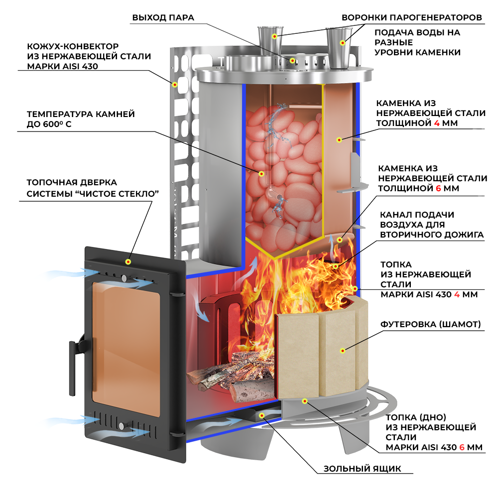 Печь для бани EVEREST Steam Master 60 INOX (320М) изготовлена из нержавеющей стали. Печь предназначена для установки в частные и коммерческие бани с объёмами парных помещений до 60 кубических метров.Печь и сетка внешней каменки цилиндрической формы, компактная и удобно размещаемая в парилке. Выносной тоннель при монтаже печи проводится через стену и предполагает обслуживание печи из смежного помещения.Конструкция печи включает в себя закрытую каменку из нержавеющей стали марки AISI-430 толщиной 4-6 мм, расположенную в верхней части топки. Каменка размещена прямо на пути пламени и дымовых газов, что позволяет нагреть камни до температур свыше 600 градусов по Цельсию.Для максимального сохранения тепла и повышения тепловой эффективности печи нижняя часть боковой стенки топки облицована шамотным кирпичом. Защищённая от перегрева стенка будет служить дольше, а КПД печи будет выше.Для эффективного сгорания топлива на задней стороне топки предусмотрен широкий канал для подачи воздуха на вторичное горение.Каменка рассчитана на 75 кг камня для бани мелкой и средней фракции. Воду подают в каменку с помощью двух заливных воронок, посредством которых вода попадает на нижний и средний ярусы уложенных камней. Пар выходит через верхнюю крышку с отверстиями.Крышка печи и каменка – съёмные элементы, позволяют ухаживать за топкой и каменкой. В крышке топки есть два прочистных отверстия для обслуживания дымохода и верхней части каменки. Отверстия закрыты стальными заглушками.Печь подключается к дымоходу диаметром 150 мм.Стальная дверь артикул 320 М оснащена системами подачи воздуха в колосниковую зону и на стекло. С помощью размещённых в двери отверстий можно регулировать интенсивность горения дров и обеспечивать чистоту стекла.Внешний тепловой контур образован открытой каменкой в виде цилиндрической сетки, вмещающей в себя 235 килограммов камней. Сетка сделана из стали, в новом минималистичном дизайне EVEREST.