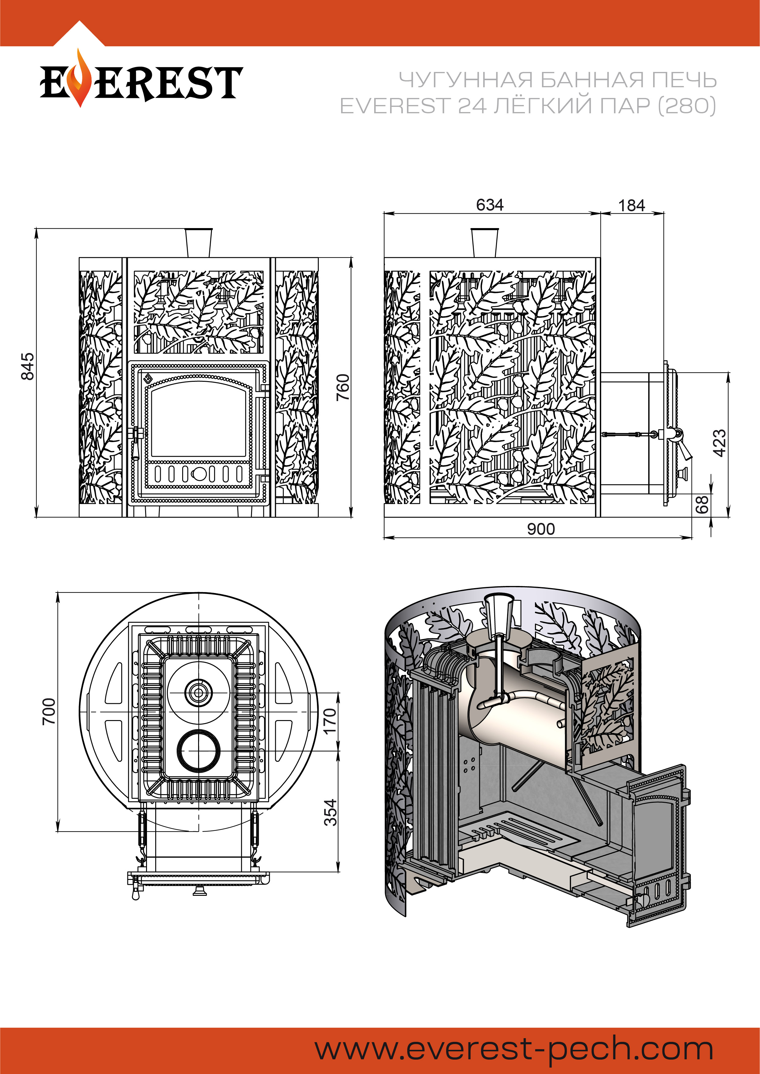 Банные печи Эверест Лёгкий Пар из жаропрочного чугуна отличает наличие закрытой каменки, выполненной из экологичной, экономичной нержавеющей стали марки AISI 430.Такое дополнение в обновленном ряду Эверест позволяет получить от печей серии Лёгкий Пар любую требуемую разновидность пара. Капельная подача воды, через специальную систему в закрытую каменку, позволяет получить качественный перегретый мелкодисперсный пар в нужных количествах, не боясь залива каменки. При этом лучшие характеристики линейки печей Эверест из жаропрочного чугуна остались на высоком уровне:заводской чугун оптимальной толщины;большая теплоёмкость;значительная мощность печи;простая для установки конструкция.Модель выпускается с двумя типами дверок - с глухой дверкой и дверкой со стеклом.В комплектацию входит: Сборная печь со съёмным топочным тоннелем и чугунной дверкой.Цилиндрическая закрытая каменка из нержавеющей стали марки AISI 430, рассчитанная на загрузку 35-40 кг камней мелкой фракции.Система капельной подачи воды на камни закрытой каменки.Канал для подачи воздуха в область вторичного дожига.Массивный чугунный колосник.Зольный ящик, выполненный из прочной стали, позволяющий оперативно проводить уборку печи.Стальной конвекционный кожух для укладывания камней.Термостойкий герметик для сборки печи.Инструкция по монтажу и эксплуатации.Эверест Лёгкий Пар рассчитан на работу в парной объёмом от 12 до 24 кубических метров.Конструкция печи сборная, корпус состоит из чугунных плит с оребрением по наружной стороне для увеличения площади теплоотдачи. Печь после обжига собирается в парной, на месте установки, скрепляется на герметик.Крышка топочной камеры с закруглением угловых частей. Гладкая крышка не позволяет дымовым газам скапливаться в углах и обеспечивает более полное сгорание топлива. Как результат такой конструкции вы получите большую тепловую эффективность чугунной печи Лёгкий Пар.Выход патрубка дымохода располагается в верхней крышке топки, отделяясь от камеры сгорания закрытой каменкой, выполняющей роль пламегасителя. Дым попадает в дымоход, предварительно отдав максимум энергии нижней части закрытой каменки и лежащим на ней камням.