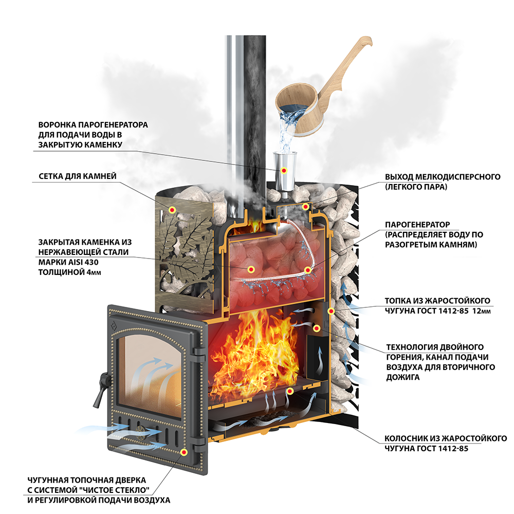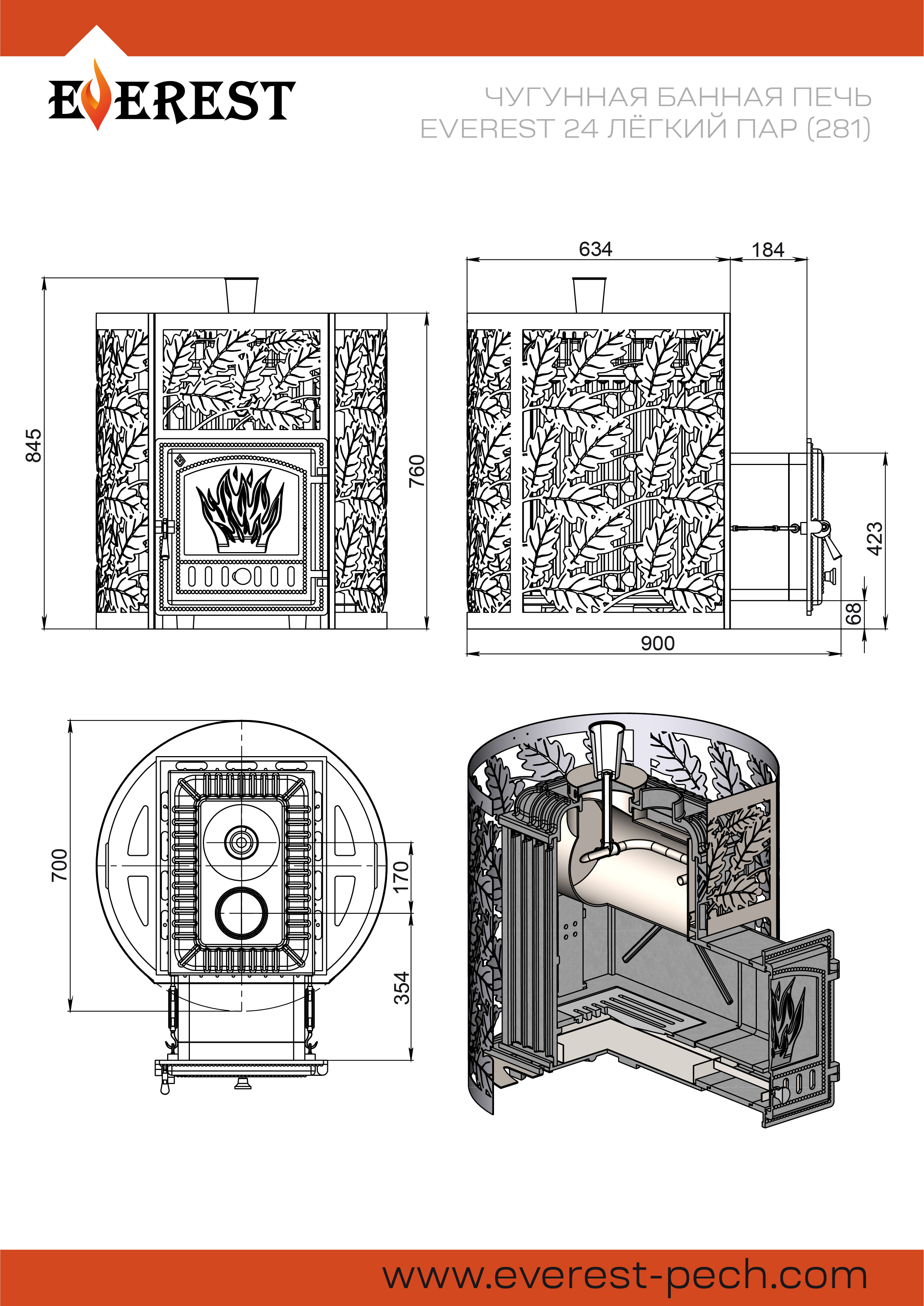 Банные печи Эверест Лёгкий Пар из жаропрочного чугуна отличает наличие закрытой каменки, выполненной из экологичной, экономичной нержавеющей стали марки AISI 430.Такое дополнение в обновленном ряду Эверест позволяет получить от печей серии Лёгкий Пар любую требуемую разновидность пара. Капельная подача воды, через специальную систему в закрытую каменку, позволяет получить качественный перегретый мелкодисперсный пар в нужных количествах, не боясь залива каменки. При этом лучшие характеристики линейки печей Эверест из жаропрочного чугуна остались на высоком уровне:заводской чугун оптимальной толщины;большая теплоёмкость;значительная мощность печи;простая для установки конструкция.Модель выпускается с двумя типами дверок - с глухой дверкой и дверкой со стеклом.В комплектацию входит:Сборная печь со съемным топочным тоннелем и чугунной дверкой.Цилиндрическая закрытая каменка из нержавеющей стали марки AISI 430, рассчитанная на загрузку 35-40 кг камней мелкой фракции.Система капельной подачи воды на камни закрытой каменки.Канал для подачи воздуха в область вторичного дожига.Массивный чугунный колосник.Зольный ящик, выполненный из прочной стали, позволяющий оперативно проводить уборку печи.Стальной конвекционный кожух для укладывания камней.Термостойкий герметик для сборки печи.Инструкция по монтажу и эксплуатации.Эверест Лёгкий Пар рассчитан на работу в парной объёмом от 14 до 26 кубических метров.Конструкция печи сборная, корпус состоит из чугунных плит с оребрением по наружной стороне для увеличения площади теплоотдачи. Печь после обжига собирается в парной, на месте установки, скрепляется на герметик.Крышка топочной камеры с закруглением угловых частей. Гладкая крышка не позволяет дымовым газам скапливаться в углах и обеспечивает более полное сгорание топлива. Как результат такой конструкции вы получите большую тепловую эффективность чугунной печи Лёгкий Пар.Выход патрубка дымохода располагается в верхней крышке топки, отделяясь от камеры сгорания закрытой каменкой, выполняющей роль пламегасителя. Дым попадает в дымоход, предварительно отдав максимум энергии нижней части закрытой каменки и лежащим на ней камням.