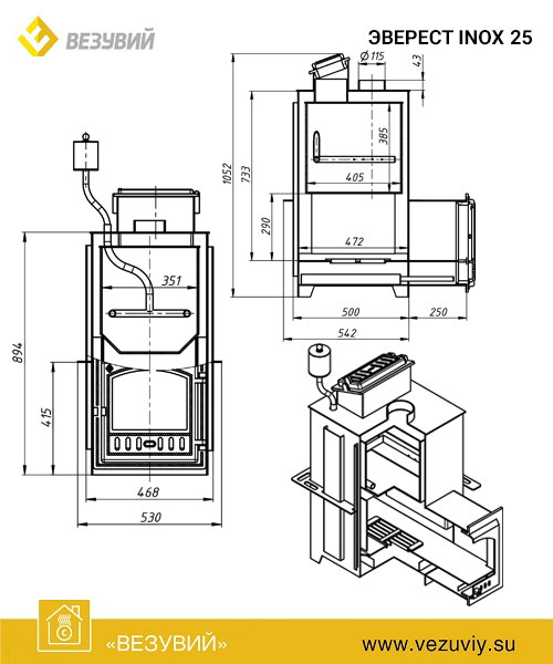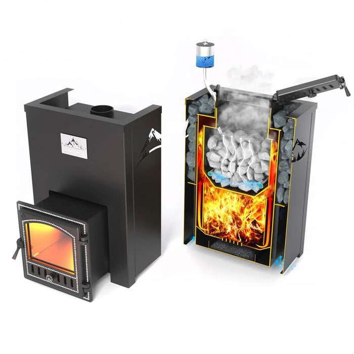 Печь для бани Эверест INOX 25 (280) под обкладку предназначена для парных объёмом от 22 до 28 кубических метров. Печи INOX изготовлены из нержавеющей стали марки AISI 430, толщиной от 4 до 6 мм. Более толстая сталь идёт на изготовление закрытой каменки, а топочная часть печи сделана из стали толщиной 4 мм. Из такой же стали сделан топочный тоннель. Ключевым элементом печей INOX является закрытая каменка, размещённая над топочным пространством. Толстые стенки каменки выполняют функцию зуба-отбойника. Пламя и нагретые газы обтекают каменку с пяти сторон, позволяя быстро нагревать закладываемые вовнутрь камни до температуры 550 - 600 градусов. Вода из верхней ёмкости по трубкам поступает в нижнюю часть каменки и через точечные отверстия равномерно попадает на камни. Система позволяет получать мелкодисперсный пар без чрезмерного остывания камней. Для выхода пара в верхней части каменки оборудована дверка. Система регулирования воздушного потока чугунной дверки помогает чётко дозировать количество пара, выходящего из каменки.Все печи Эверест INOX снаружи окрашены термостойкой краской для защиты от внешних повреждений. Краска полностью набирает свои свойства после первой протопки печи и нагрева стенок в течение 45-50 минут. Печи Эверест INOX спроектированы для использования в режиме повышенной активности (парение более 5 часов подряд, парение 3-4 раза в неделю).Для обеспечения хорошей конвекции в парной и быстрого прогрева помещения печи из нержавеющей стали могут быть оборудованы стальными кожухами. Кожух заменяет каменную или кирпичную обкладку печи INOX и позволяет сократить время на оборудование парной.