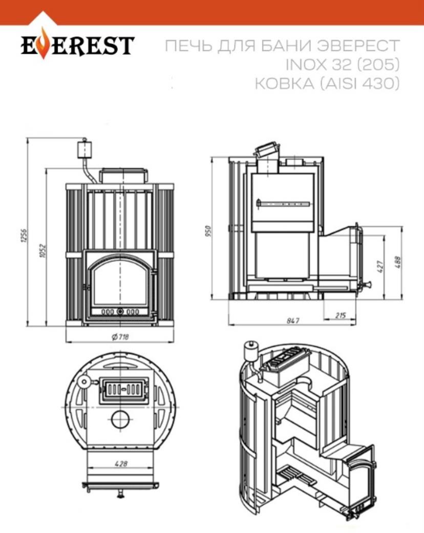Банная печь Эверест INOX 32 (205) Ковка (AISI 430) подходит для парных объёмом от 22 до 32 кубических метров. Печи INOX изготовлены из нержавеющей стали марки AISI 430, толщиной от 4 до 6 мм. Более толстая сталь идёт на изготовление закрытой каменки, а топочная часть печи сделана из стали толщиной 4 мм. Из такой же стали сделан топочный тоннель.Закрытая каменка печи нагревается с 5ти сторон, благодаря чему температура камней в ней получается порядка 550-600°С. Вода на камни подается через специальную емкость, вынесенную наружу, и далее по системе трубок с отверстиями попадает в самое горячее место каменки, обеспечивая образование мелкодисперсного пара.Благодаря выносному топливному каналу печь можно топить из предбанника, комнаты отдыха.Большая масса закладываемых камней обеспечивает большое количество пара и длительное остывание печи.Интенсивность горения регулируется выдвижным зольным ящиком.Сетка-каменка комбинированная: в ней используется стальной пруток и кованая лента. Декоративные дубовые листочки на корпусе выполнены в стиле традиционной русской бани.