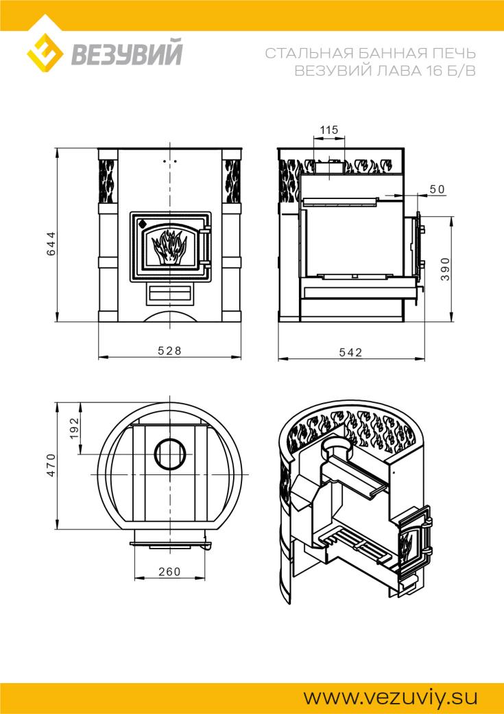 Стальная банная печь серии Лава усовершенствованной конструкции работает на дровах и предназначена для нагрева пространства парной и получения пара. Печь Везувий Лава 16 (ДТ-3) б/в рассчитана на объем парной 8-18 кубометров.Топка печи изготовлена из особо прочной котловой стали марки 09Г2С. Толщина верхней и задней части 6 мм, толщина боковых стенок 4 мм. Топка имеет скошенные углы в нижней части боковых стенок топки. Такая конструкция облегчает уход за топкой, предотвращает высокую тепловую нагрузку на боковые стенки печи и обеспечивает дополнительную жёсткость стенок. Вместе с тем, данная конструкция стенок предполагает направление дров ближе к колосниковой решётке, что обеспечивает полное прогорание топлива.В печи обеспечен дожиг вторичных газов посредством широкого П-образного профиля на задней поверхности топки, который, доставляя воздух в зону активного горения, увеличивает КПД печи и дополнительно усиливает заднюю стенку печи.Кожух из стального листа и кованых стальных колец предназначен для обеспечения конвекции устройства открытой каменки и дополнительно защищает парящихся от жёсткого инфракрасного излучения. В верхней части кожуха для усиления движения воздуха сделаны прорезные отверстия в виде языков пламени. Чугунные детали, дверка, колосник, пламегаситель, не меняют своей геометрии во время топки, хорошо противостоят высокой температуре. Зольный ящик совкового типа отлично подходит для уборки печи и удаления золы. Чугунный пламегаситель является съёмным элементом, что облегчает прочистку печи. В то же время, пламегаситель зафиксирован от продольного перемещения, что является гарантией единственно правильного положения элемента в печи.В печи обеспечена возможность горения дров в тоннеле. Тоннель выполнен из стали 4 мм, а дно тоннеля расположено на одном уровне с дном топки для беспрепятственного перемещения углей в глубь топки.Важные преимущества банных печей серии Лава:- Особо прочная котловая сталь марки 09Г2С.- Чугунный пламегаситель (зуб отбойник).- Чугунная топочная дверь.- Чугунная колосниковая решётка.- Конвекционно-вентилируемый кожух, вмещающий до 50 кг камней.