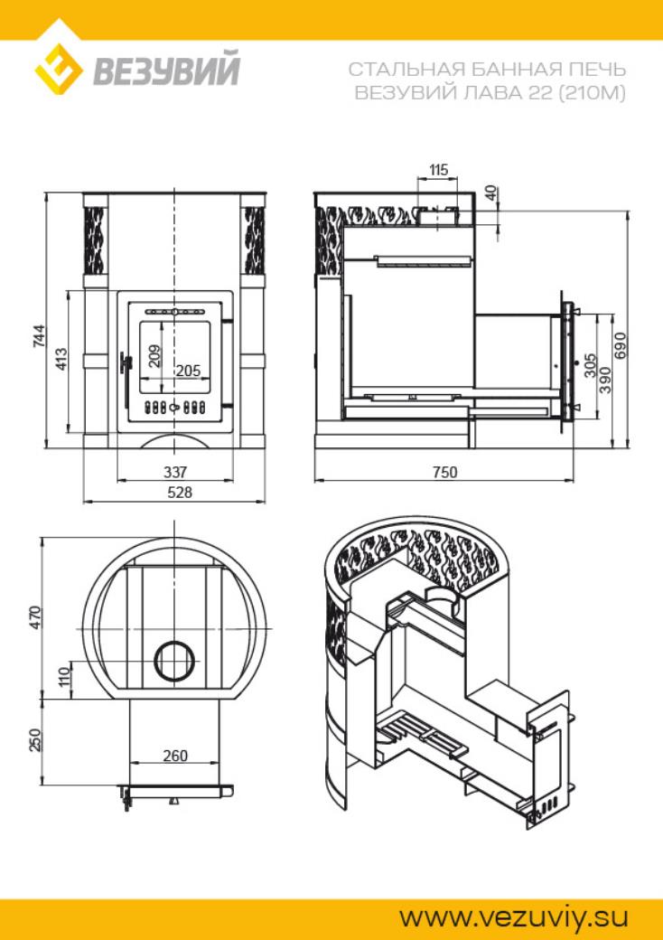 Стальная банная печь серии Лава усовершенствованной конструкции работает на дровах и предназначена для нагрева пространства парной и получения пара. Печь ВЕЗУВИЙ Лава 22 (210) "М" 2022 рассчитана на объем парной 12-24 кубометров.Топка печи изготовлена из особо прочной котловой стали марки 09Г2С. Толщина верхней и задней части 6 мм, толщина боковых стенок 4 мм. Топка имеет скошенные углы в нижней части боковых стенок топки. Такая конструкция облегчает уход за топкой, предотвращает высокую тепловую нагрузку на боковые стенки печи и обеспечивает дополнительную жёсткость стенок. Вместе с тем, данная конструкция стенок предполагает направление дров ближе к колосниковой решётке, что обеспечивает полное прогорание топлива.В печи обеспечен дожиг вторичных газов посредством широкого П-образного профиля на задней поверхности топки, который, доставляя воздух в зону активного горения, увеличивает КПД печи и дополнительно усиливает заднюю стенку печи.Кожух из стального листа и кованых стальных колец предназначен для обеспечения конвекции устройства открытой каменки и дополнительно защищает парящихся от жёсткого инфракрасного излучения. В верхней части кожуха для усиления движения воздуха сделаны прорезные отверстия в виде языков пламени. Чугунные детали - колосник и пламегаситель, не меняют своей геометрии во время топки, хорошо противостоят высокой температуре. Зольный ящик совкового типа отлично подходит для уборки печи и удаления золы. Чугунный пламегаситель является съёмным элементом, что облегчает прочистку печи. В то же время, пламегаситель зафиксирован от продольного перемещения, что является гарантией единственно правильного положения элемента в печи.В печи обеспечена возможность горения дров в тоннеле. Тоннель выполнен из стали 4 мм, а дно тоннеля расположено на одном уровне с дном топки для беспрепятственного перемещения углей в глубь топки.Важные преимущества банных печей серии Лава:- Особо прочная котловая сталь марки 09Г2С.- Чугунный пламегаситель (зуб отбойник).- Стальная топочная дверь.- Чугунная колосниковая решётка.- Конвекционно-вентилируемый кожух, вмещающий до 50 кг камней.