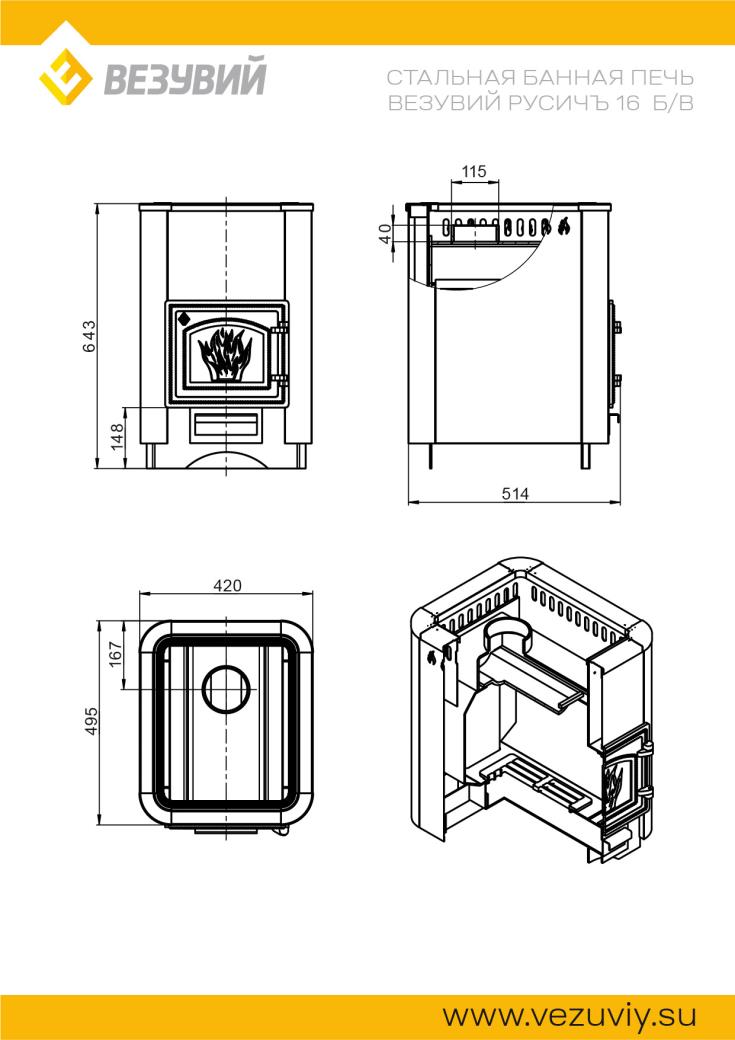 Конвекционная банная печь ВЕЗУВИЙ Русичъ Антрацит 16 (ДТ-3) б/в изготовлена из особо прочной котловой стали марки 09Г2С толщиной 4-6 мм и может устанавливаться в парную объёмом от 8 до 18 кубических метров.Стальная топка имеет скошенные углы в нижней части боковых стенок, что делает уход за топочным пространством максимально простым, а эффективность сгорания дров – максимальным.Канал для подачи вторичного дожига расположен на задней поверхности топки и проходит снизу, из поддувала, вверх, в дымосборник. Он существенно усиливает горение в верхней части печи и повышает количество получаемого от топлива энергии.Стальной кожух печи зафиксирован на корпусе, для улучшения конвекции оснащён прорезными отверстиями в верхней части. Внутренние вырезы обеспечивают попадание холодного воздуха к камням, наружные – нагрев воздуха в парной. Открытая каменка устраивается путём закладывания верхней части топки банными камнями. Для камней средней и крупной фракции предназначен внутренний короб с вертикальными отверстиями.Дверка, пламегаситель и колосник изготовлены из чугуна, что увеличивает их прочность и срок службы.Интенсивность подачи воздуха в зону горения регулируется зольным ящиком совкового типа.Преимущества печей серии Русичъ:- Особо прочная котловая сталь марки 09Г2С 4-6 мм.- Чугунный пламегаситель.- Чугунная топочная дверь.- Чугунная колосниковая решётка.- Конвекционно-вентилируемый кожух вмещающий до 50 кг камней.