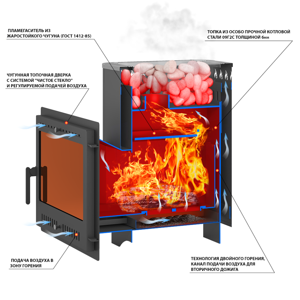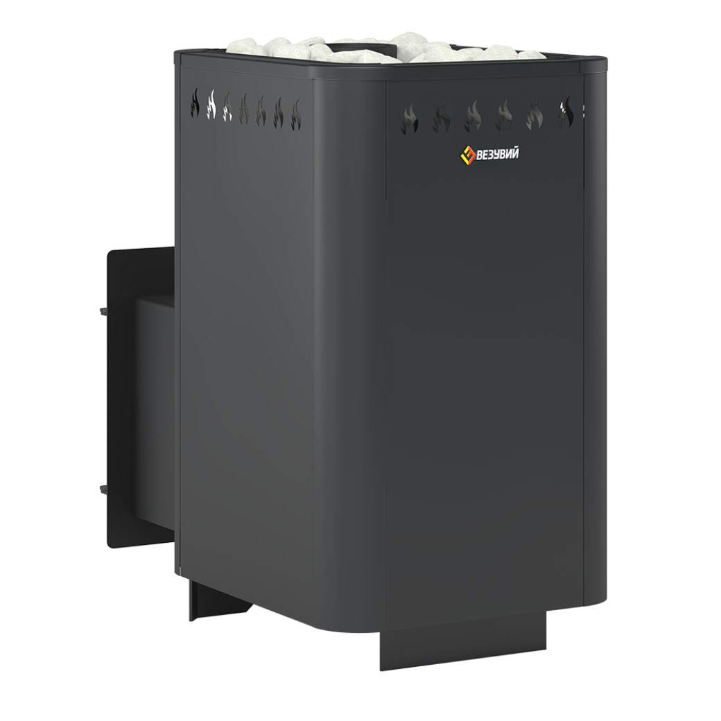 Банная Печь ВЕЗУВИЙ Русичъ Антрацит 22 (210) "М" 2022 изготовлена из особо прочной котловой стали марки 09Г2С толщиной 4-6 мм и может устанавливаться в парную объёмом от 12 до 24 кубических метров.Стальная топка имеет скошенные углы в нижней части боковых стенок, что делает уход за топочным пространством максимально простым, а эффективность сгорания дров – максимальной.Канал для подачи вторичного дожига расположен на задней поверхности топки и проходит снизу, из поддувала, вверх, в дымосборник. Он существенно усиливает горение в верхней части печи и повышает количество получаемого от топлива энергии.Стальной кожух печи зафиксирован на корпусе, для улучшения конвекции оснащён прорезными отверстиями в верхней части. Внутренние вырезы обеспечивают попадание холодного воздуха к камням, наружные – нагрев воздуха в парной. Открытая каменка устраивается путём закладывания верхней части топки банными камнями. Для камней средней и крупной фракции предназначен внутренний короб с вертикальными отверстиями.Пламегаситель и колосник изготовлены из чугуна, что увеличивает их прочность и срок службы.Интенсивность подачи воздуха в зону горения регулируется зольным ящиком совкового типа.Стальная дверь изготовлена из особо прочной стали толщиной 2 мм, оборудована термостойким стеклом и выдерживает температуру до 650 градусов. Подача воздуха для колосникового горения происходит через нижние отверстия двери. Интенсивность горения регулируют закрытием заслонки на отверстиях. Верхний ряд отверстий подаёт воздух на стекло и отсекает дымовые газы от дверки. Так обеспечивается чистота стекла во время топки и отсутствие сажи на внутренних поверхностях дверки.Преимущества печей серии Русичъ:- Особо прочная котловая сталь марки 09Г2С 4-6 мм.- Чугунный пламегаситель.- Чугунная топочная дверь.- Чугунная колосниковая решётка.- Конвекционно-вентилируемый кожух вмещающий до 50 кг камней.