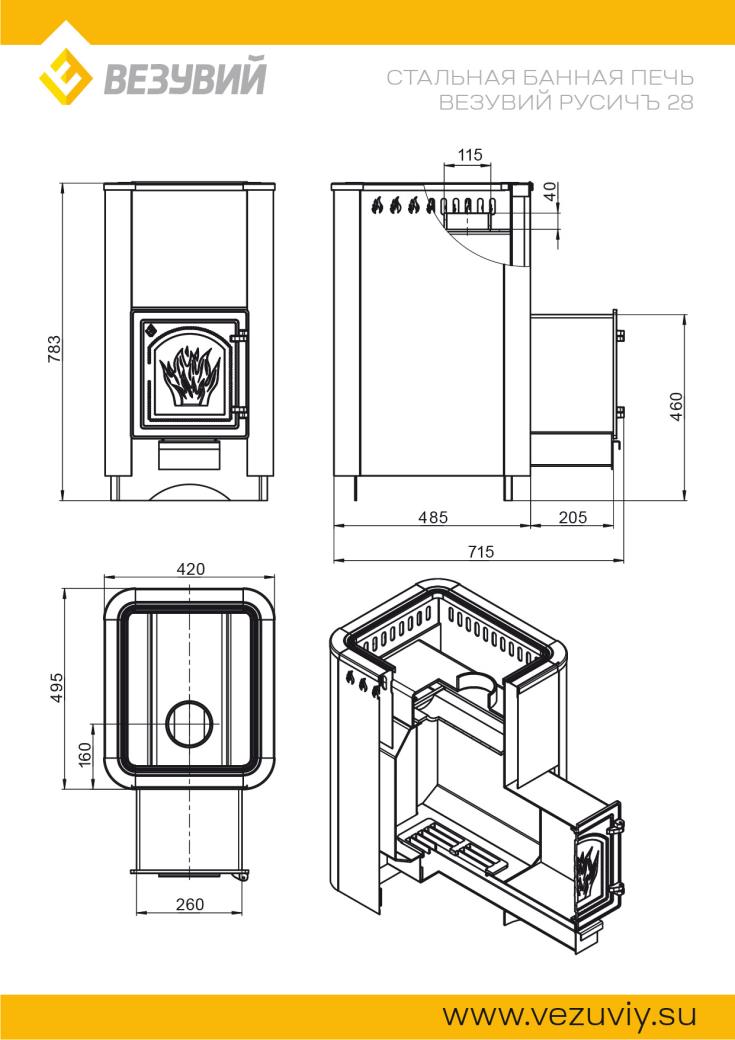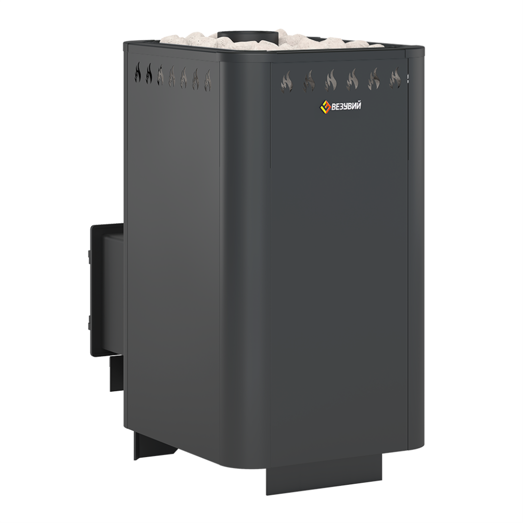 Конвекционная банная печь ВЕЗУВИЙ Русичъ Антрацит 28 (ДТ-4) изготовлена из особо прочной котловой стали марки 09Г2С толщиной 4-6 мм и может устанавливаться в парную объёмом от 14 до 30 кубических метров.Стальная топка имеет скошенные углы в нижней части боковых стенок, что делает уход за топочным пространством максимально простым, а эффективность сгорания дров – максимальным.Канал для подачи вторичного дожига расположен на задней поверхности топки и проходит снизу, из поддувала, вверх, в дымосборник. Он существенно усиливает горение в верхней части печи и повышает количество получаемого от топлива энергии.Стальной кожух печи зафиксирован на корпусе, для улучшения конвекции оснащён прорезными отверстиями в верхней части. Внутренние вырезы обеспечивают попадание холодного воздуха к камням, наружные – нагрев воздуха в парной. Открытая каменка устраивается путём закладывания верхней части топки банными камнями. Для камней средней и крупной фракции предназначен внутренний короб с вертикальными отверстиями.Дверка, пламегаситель и колосник изготовлены из чугуна, что увеличивает их прочность и срок службы.Интенсивность подачи воздуха в зону горения регулируется зольным ящиком совкового типа.Преимущества печей серии Русичъ:- Особо прочная котловая сталь марки 09Г2С 4-6 мм.- Чугунный пламегаситель.- Чугунная топочная дверь.- Чугунная колосниковая решётка.- Конвекционно-вентилируемый кожух вмещающий до 50 кг камней.
