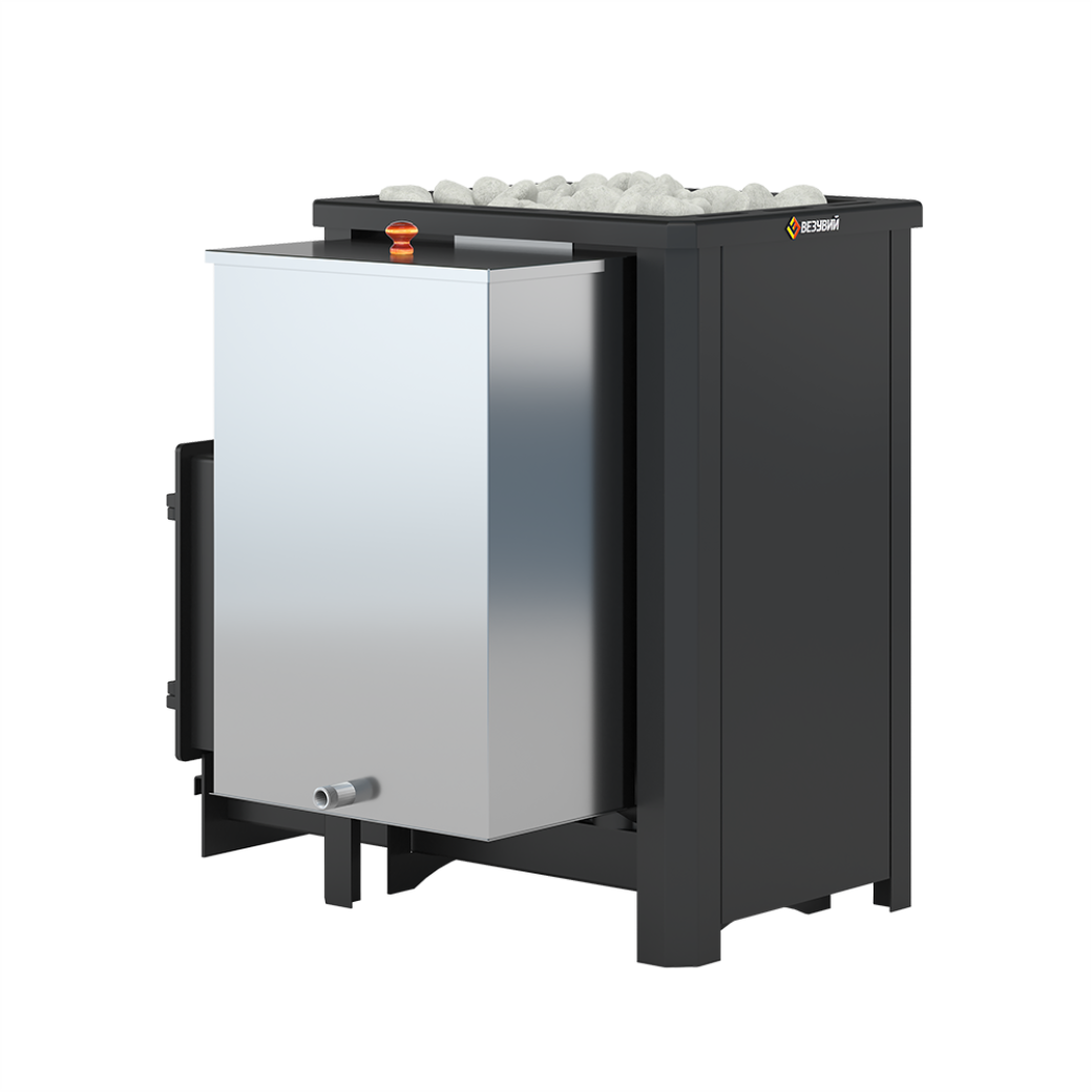 ВЕЗУВИЙ Русичъ «АКВА» 22 (ДТ-4) – стальная банная печь с баком для нагрева воды. Конструкция печи позволяет нагревать и использовать воду прямо во время парения.Русичъ Аква сделана из особо прочной котловой стали 09Г2С толщиной от 4 до 6 мм. Стальная топка оборудована дверцей ДТ-4 из чугуна. Объём топки позволяет быстро и качественно нагреть парилку и одновременно получить достаточное количество горячей воды.Воздух для горения дров поступает из нижней части печи через чугунный колосник. Регулирование интенсивности горения происходит путем закрывания или открывания зольного ящика.Конструкция топки позволяет максимально использовать энергию горения дров и нагревать воду без ущерба для парообразования.Конвекционный кожух обеспечивает активное движение воздуха и прогрев расчётного объёма парилки за минимальное время. Закладом камней в кожух организуют открытую каменку для получения плотного пара.Бак из нержавеющей стали толщиной 1 мм объёмом от 39 до 61 литра нагревается от стенки печи. Бак навешивается на боковую поверхность печи с помощью специального кронштейна на баке. Заполнение бака водой осуществляют через верхнюю крышку. В зависимости от модели печи и объёма бака, воды хватает на 3-5 человек.При необходимости на печь можно установить два бака с двух боковых сторон печи. Бак поставляется отдельно.