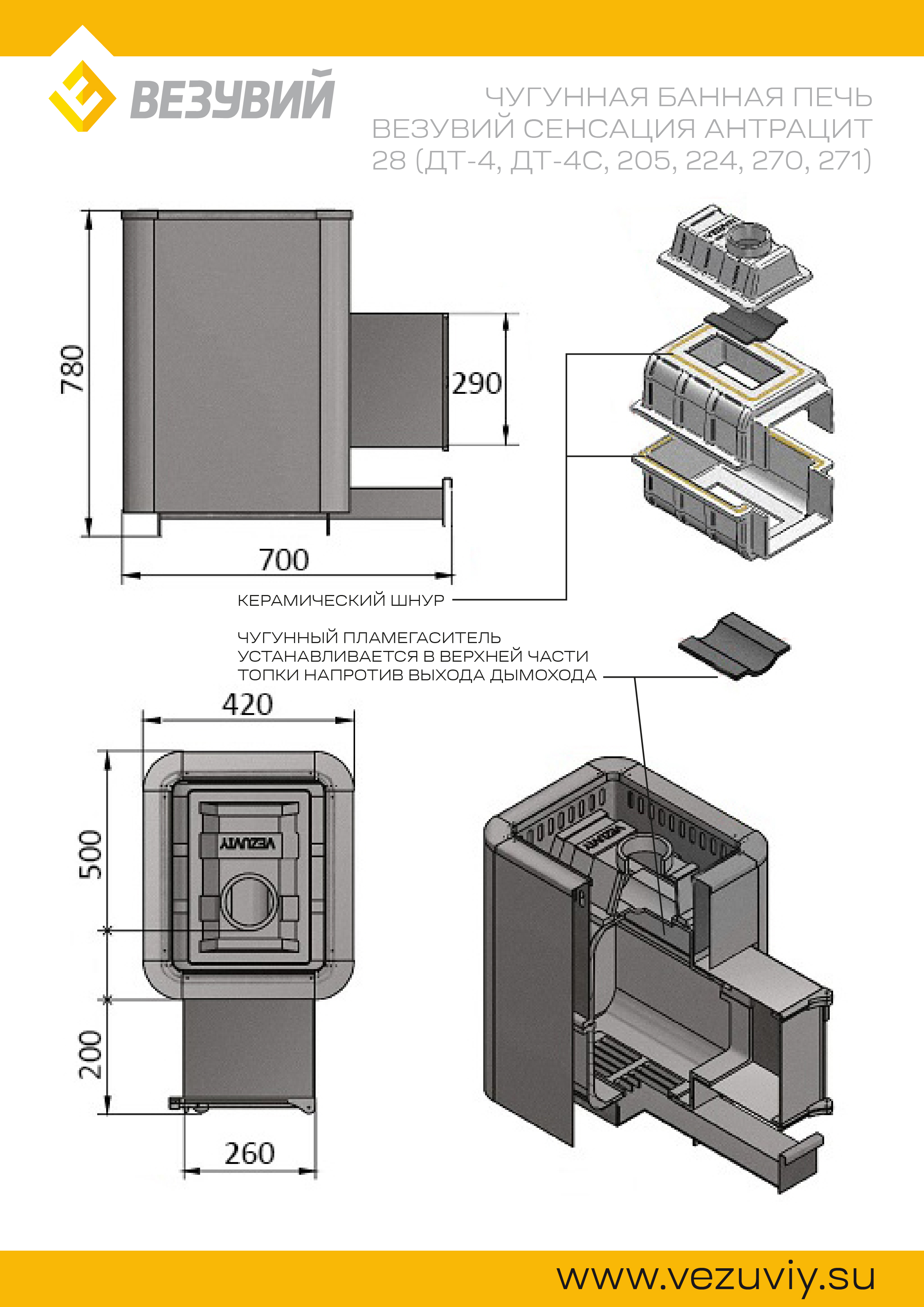 Преимущество печи в том, что топка печи состоит из 3-х элементов. На стыке между ними используется керамический шнур с рабочей температурой 1200 градусов. То есть топка печи абсолютно герметична! Для фиксации деталей между собой применяется болтовое соединение, что даёт 100% гарантию безопасности при эксплуатации.Преимущество печи «Сенсация» объемная, вентилируемая каменка позволяющая максимально быстро нагреть камни с четырёх сторон в кратчайшие сроки. Большая масса камней, закладываемая в каменку печи, нагревается до 350 °С, что позволяет обеспечить стабильность температуры в парилке и является мощным парогенератором. Поверхность нагрева печи охвачена сверхъемким наружным конвекционно-вентилируемым кожухом, что значительно ускоряет нагревание воздуха в парилке за счёт образуемого им мощного конвекционного потока.Банная чугунная печь Сенсация 16 (205) укомплектована чугунной герметичной дверцей Везувий 205 с жаропрочным стеклом «SCHOTT ROBAX».