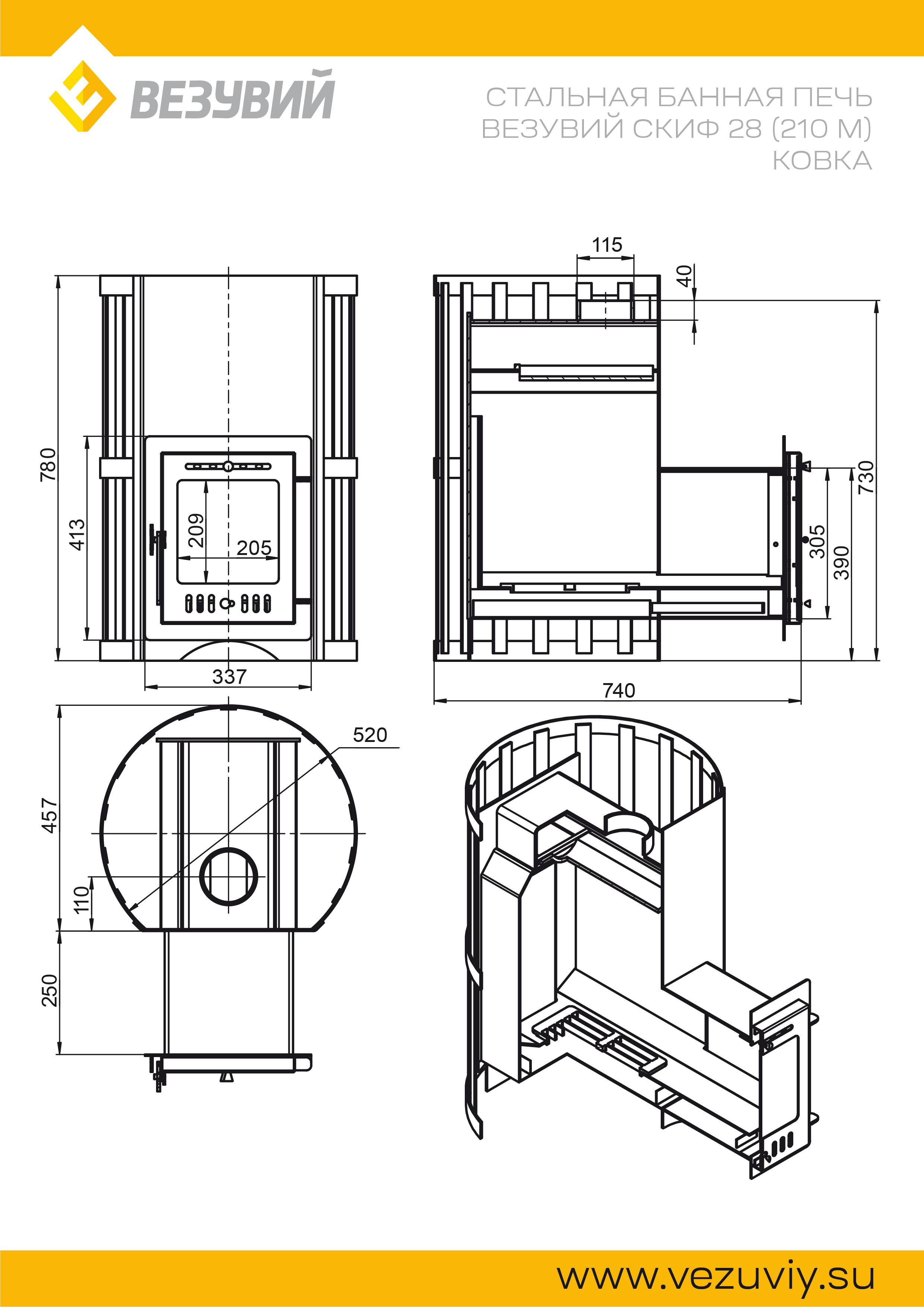 Стальная банная печь ВЕЗУВИЙ Скиф Ковка 28 (210) "М" предназначена для прогрева парного помещения в бане и поддержания необходимой температуры во время парения. Печь СКИФ оборудована открытой каменкой, закладываемой камнями для бани (приобретаются отдельно).Печь изготовлена из особо прочной котловой стали 09Г2С, рассчитанной на работу при высоких температурах и давлении. Толщина стенок печи 4-6 мм. Топочный тоннель также выполнен из стали марки 09Г2С толщиной 4 мм, и позволяет использовать дрова длиной более 50 см. Топка оснащена каналом для подачи воздуха на вторичный дожиг дымовых газов. Канал проходит по задней стенке топки снизу вверх и подаёт воздух для горения в верхние отделы топки. Такая конструкция повышает экономичность печи и увеличивает КПД агрегата.Съёмный чугунный колосник в сочетании со скошенными краями боковой части стенки облегчает уход за топкой, уборку золы и несгоревших углей. Воздух в зону горения подаётся через поддувало, спереди закрытое дверью печи. Стальная дверь изготовлена из особо прочной стали толщиной 2 мм, оборудована термостойким стеклом и выдерживает температуру до 650 градусов. Подача воздуха для колосникового горения происходит через нижние отверстия двери. Интенсивность горения регулируют закрытием заслонки на отверстиях. Верхний ряд отверстий подаёт воздух на стекло и отсекает дымовые газы от дверки. Так обеспечивается чистота стекла во время топки и отсутствие сажи на внутренних поверхностях дверки. Чугунный пламегаситель перенаправляет поток горячего воздуха и дымовых газов к задней части топки. Это позволяет снять с печи максимум энергии в единицу времени. Печи Везувий СКИФ оснащаются сеткой для камней. Сетка сделана из кованой стальной ленты шириной 40 мм. В сетку по всей высоте укладываются камни для бани, обеспечивая большой объём заклада и длительное удержание тепла после прогрева каменки.