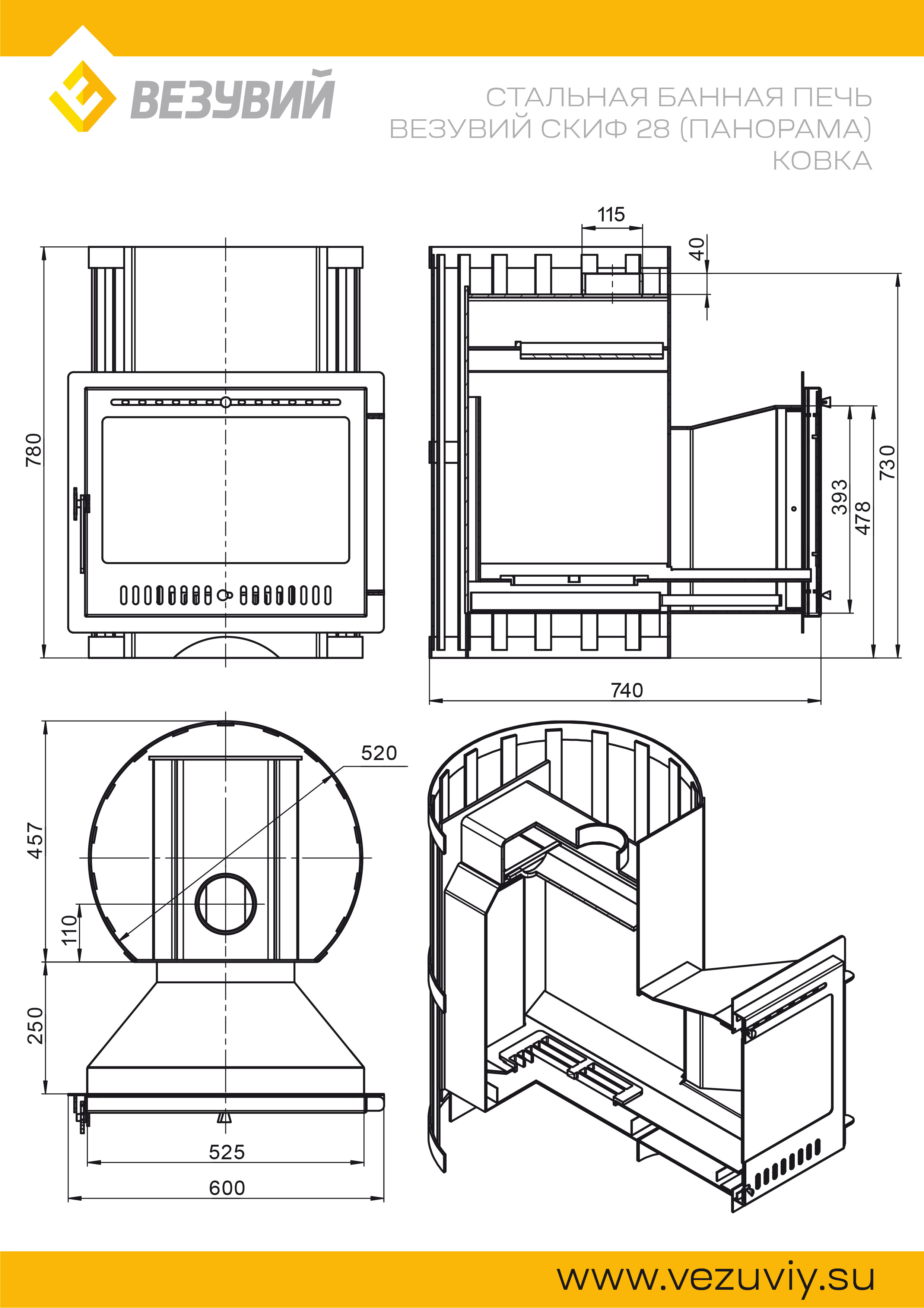 Стальная банная печь ВЕЗУВИЙ Скиф 28 Панорама Ковка предназначена для прогрева парного помещения в бане и поддержания необходимой температуры во время парения.Печь СКИФ оборудована открытой каменкой, закладываемой камнями для бани (приобретаются отдельно). Печь изготовлена из особо прочной котловой стали 09Г2С, рассчитанной на работу при высоких температурах и давлении. Толщина стенок печи 4-6 мм. Топочный тоннель также выполнен из стали марки 09Г2С толщиной 4 мм, что позволяет топить дрова длиной более 50 см. Топка оснащена каналом для подачи воздуха на вторичный дожиг дымовых газов. Канал проходит по задней стенке топки снизу вверх и подаёт воздух для горения в верхние отделы топки. Такая конструкция повышает экономичность печи и увеличивает КПД агрегата.Съёмный чугунный колосник в сочетании со скошенными краями боковой части стенки облегчает уход за топкой, уборки золы и несгоревших углей.Воздух в зону горения подаётся через поддувало, его количество регулируется зольным ящиком совкового типа. Открытый зольник усиливает горение, закрытый – замедляет его. Широкая стальная панорамная дверь оборудована термостойким стеклом и выдерживает температуру до 650 градусов. В двери имеются системы верхней и нижней подачи воздуха. Нижняя подача обеспечивает правильное регулируемое горение дров в топке. С её помощью меняется интенсивность сжигания дров — закрывая заслонку, вы уменьшаете силу горения. Верхняя система подаёт воздух на стекло и таким образом отсекает дымовые газы от дверки. Так обеспечивается чистота стекла во время топки и отсутствие сажи на внутренних поверхностях дверки.Чугунный пламегаситель перенаправляет поток горячего воздуха и дымовых газов к задней части топки. Это позволяет снять с печи максимум энергии в единицу времени. Чугунная дверь при нагревании не деформируется, сохраняет свою форму при остывании и предотвращает попадание продуктов горения на пол перед топкой. Печи Везувий СКИФ оснащаются сетками для камней. Сетки могут быть сделаны из металлического прутка или кованой стальной ленты шириной 40 мм. В сетки по всей высоте укладываются камни для бани, обеспечивая большой объём заклада и длительное удержание тепла после прогрева каменки.
