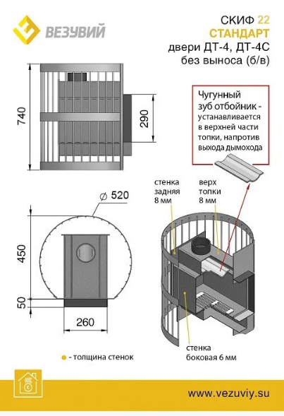 Стальная банная печь ВЕЗУВИЙ Скиф 22 (ДТ-4) Стандарт б/в предназначена для прогрева парного помещения объемом 12-24 кубических метров и поддержания необходимой температуры во время парения. Печь СКИФ оборудована открытой каменкой, закладываемой камнями для бани (приобретаются отдельно). Печь изготовлена из особо прочной котловой стали 09Г2С, рассчитанной на работу при высоких температурах и давлении. Толщина стенок печи 4-6 мм. Топочный тоннель также выполнен из стали марки 09Г2С толщиной 4 мм, что позволяет топить дрова длиной более 50 см. Топка оснащена каналом для подачи воздуха на вторичный дожиг дымовых газов. Канал проходит по задней стенке топки снизу вверх и подаёт воздух для горения в верхние отделы топки. Такая конструкция повышает экономичность печи и увеличивает КПД агрегата.Съёмный чугунный колосник в сочетании со скошенными краями боковой части стенки облегчает уход за топкой, уборки золы и несгоревших углей.Воздух в зону горения подаётся через поддувало, его количество регулируется зольным ящиком совкового типа. Открытый зольник усиливает горение, закрытый – замедляет его. Чугунный пламегаситель перенаправляет поток горячего воздуха и дымовых газов к задней части топки. Это позволяет снять с печи максимум энергии в единицу времени. Чугунная дверь при нагревании не деформируется, сохраняет свою форму при остывании и предотвращает попадание продуктов горения на пол перед топкой. Печи Везувий СКИФ оснащаются сетками для камней. Сетки могут быть сделаны из металлического прутка или кованой стальной ленты шириной 40 мм. В сетки по всей высоте укладываются камни для бани, обеспечивая большой объём заклада и длительное удержание тепла после прогрева каменки.