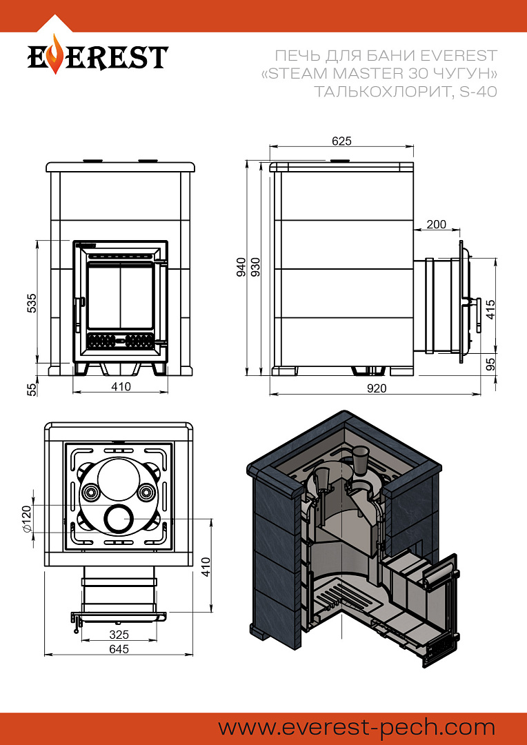 Банная печь Эверест "Steam Master" 30 ЧУГУН" Талькохлорит, S-40 предназначена для нагрева помещений и получения пара в парных объёмом до 30 м3. Печь изготовлена из качественного чугуна и отличается интересной конструкцией.Топочная камера печи – сборная, состоит из трёх деталей, соединяемых между собой на болтах. Вертикальные швы по краю деталей соединяются по принципу паз-гребень, что обеспечивает высокую герметичность топки и минимальную деформацию даже при длительном нагреве. Соединение не требует применения уплотнителей шва, достаточно только герметика. Верхняя часть топки изготовлена из чугунных колец. В печи Эверест "Steam Master" 30 ЧУГУН Талькохлорит, S-40 между топкой и крышкой размещено два кольца высотой 120 мм. Для полного сгорания топлива в топке устроены каналы вторичного дожига, подающие воздух из поддувала в верхние точки камеры, в места скопления разогретых газов.Чугунная дверь артикул 320 имеет верхнюю и нижнюю системы подачи воздуха. За счёт работы обеих систем регулируется интенсивность горения и обеспечивается чистота стекла во время работы печи.Закрытая каменка печи изготовлена из нержавеющей стали марки AISI 430 толщиной 4 мм. Каменка размещается прямо на пути пламени и горящих газов, что позволяет нагревать камни со всех сторон и быстро достигать температуры 450-500°C. Форма каменки обеспечивает максимальное снятие энергии с горящих в топке дров. Объём топки рассчитан на размещение 25-40 кг камней для бани. Для подачи воды в каменку предусмотрены 2 заливные воронки, направляющие воду в нижний и средний ярус заклада каменки. Это позволяет легче управлять паром и получать пар разной степени насыщенности. Облицовка сделана из плит натурального талькохлорита, которые соединяются в единое целое с помощью металлических шин. Каменная облицовка хорошо накапливает энергию, постепенно и равномерно отдаёт тепло в парную и защищает парящихся от вредных воздействий инфракрасного излучения. Облицовка из натурального камня отличается долговечностью и прослужит вам долгие годы. Талькохлорит – экологически чистый материал, он не выделяет вредных веществ при нагревании, полностью безопасен для здоровья.Верхняя часть облицовки – открытая, предназначена для закладывания камнями для бани и организации открытой каменки.